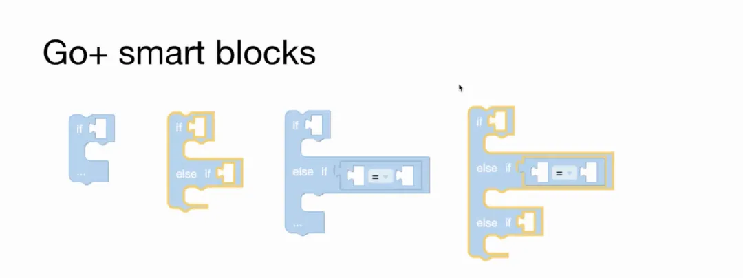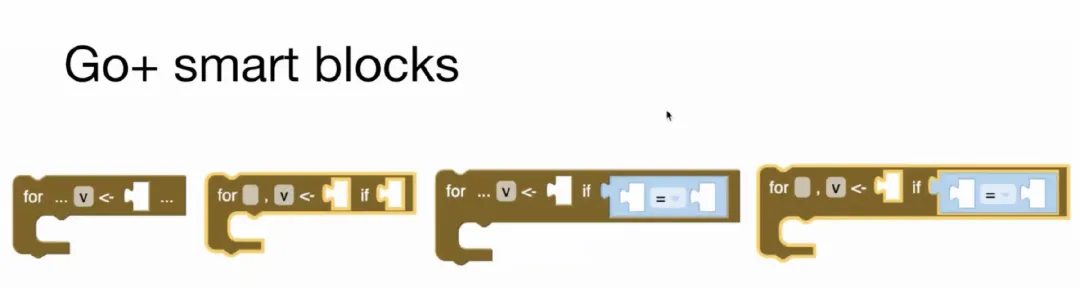下图是 smart block 的展示。它最大的优势在于不会写错语法,虽然没有 vs code 的效率高,但是因为块编程是固定的,更适合低龄学习者,降低他们的入门门槛,并且能够一直用下去。我相信再过一段时间,会有更多小朋友会选择 Go+ 来入门,并且到他大学毕业也可以一直用下去。