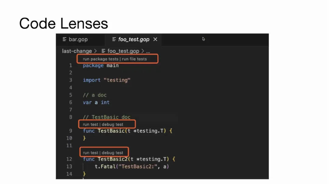 Code Lenses 也是我常用的功能,比如你有一个测试案例的代码,它会在旁边自动提示运行,这也是非常实用的功能。