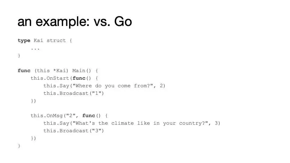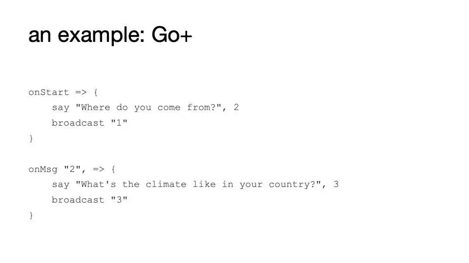 那么 Go+ 到底长啥样,在这里给大家举一个很小的例子。这是一个对话的场景,在程序开始的时候,角色一会说一句话,然后广播一个消息给另外一个人,另外的人收到这个消息以后会继续广播,以此类推。大家会发现 Go+ 的代码非常简短,但是他能够完成多个角色对话的能力,非常精简,也很直白易懂。
