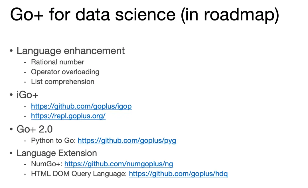 目前 Go+ 在数据科学的能力还相对薄弱,我们也在寻找加速追赶的思路。其实对照 Go+ 在工程领域借势 Go,在教育领域借势 Scratch,我们在数据科学领域的借势目标是 Python,我们希望能够让 Go+ 全面兼容 Python 的资产。也就是让 Python 的包去让 Go+ 完全引用,这是我们目前探索的方向。从 roadmap 角度来说,在 Go+ 的 2.0 版本,可以全面兼容 Python,在 1.x 的版本中,我们的重点还是会放在工程和教育领域。