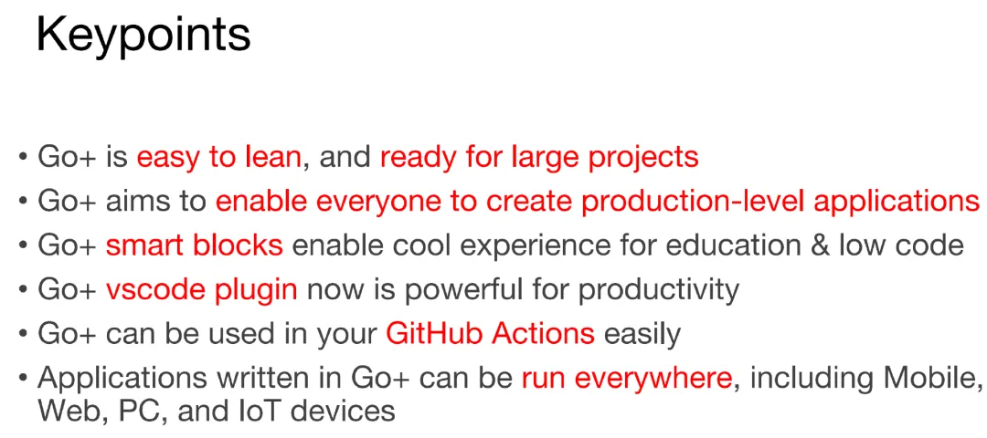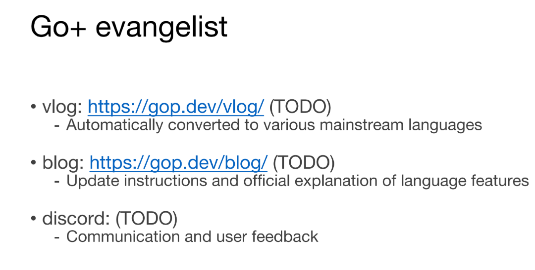 以上就是 Go+ 目前的主要情况,也欢迎大家了解 Go+,使用 Go+,加入我们的布道师团队!