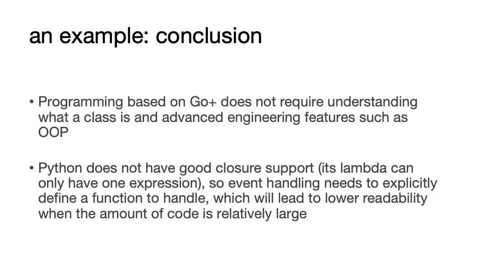 相比而言,Go+ 的语法的简洁程度明显更好,这是因为 Go+ 基本上只有函数,「If」「else」等等这样的一些控制语句,然后再加上变量等等这样最基础的一些元素,没有类,就可以做完所有的事情。