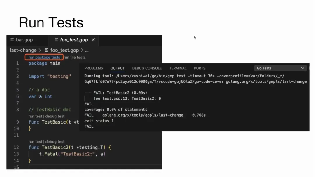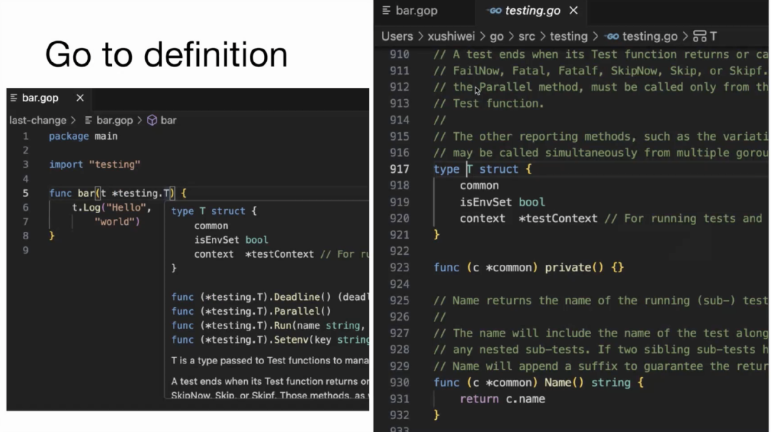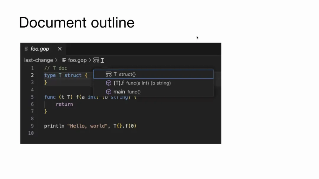 首先我们看 Document outline,通过它我们可以在打开 Go+ 文件后,快速看到其中有哪些函数并且跳转,为我们的代码写作提供便利。