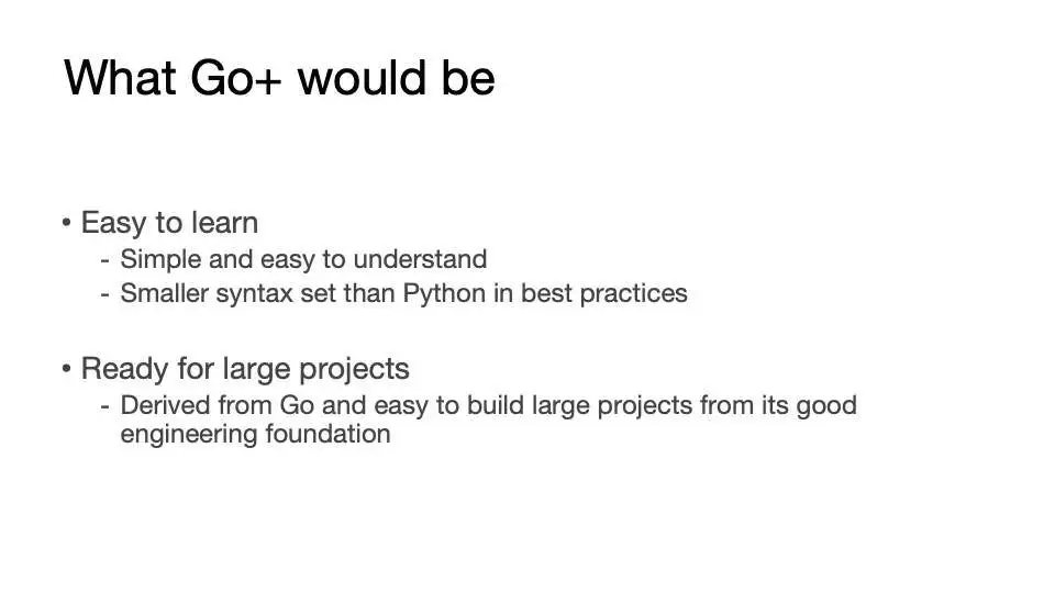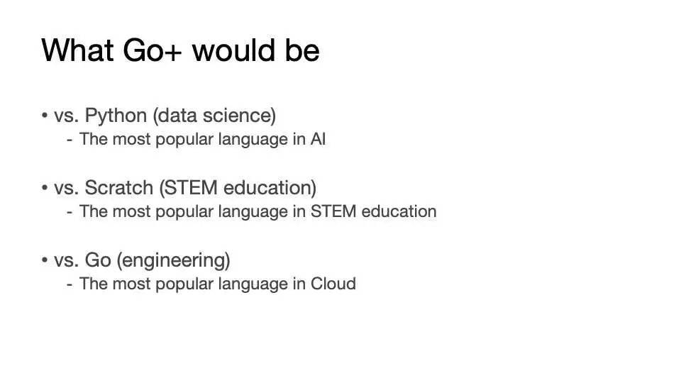 第二是我们希望 Go+ 是面向大型工程的,也就意味着它可以写非常庞大的软件而不只是初学者随便用一用。刚才提到的 Python 虽然容易学,但是在大型工程上的能力有所不足,我们希望 Go+ 在这方面做到更好。