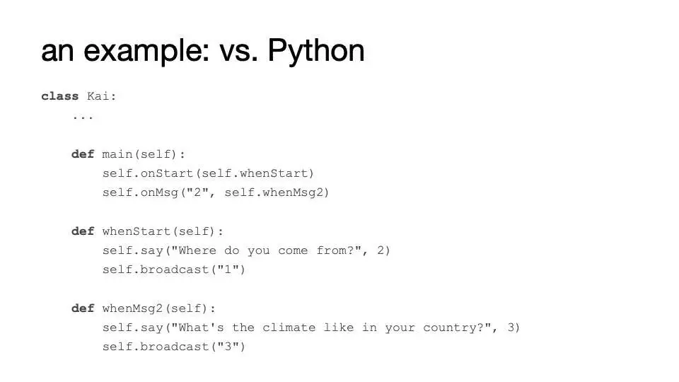 那相同能力的代码,在 Python 里面长这样。首先它会定一个类,然后再定类里面的一个函数,这个函数是启动的时候会自动执行的。