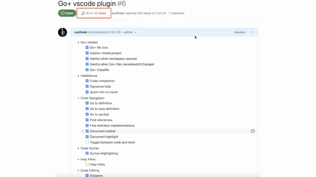 下面是 Go+ 的一些插件,大家可以在列表中看到大概有 42 项,目前已经实现了最为重要的 30 项,完成度是非常高的。