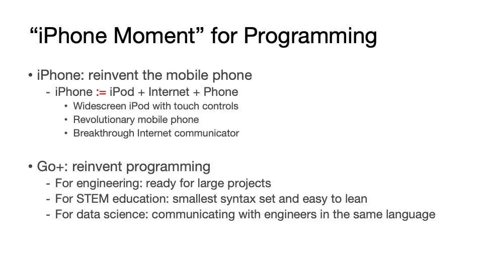 当年乔布斯发布 iPhone 的时候,为我们留下一场精彩的演讲,他把 iPhone 看作是 iPod、Internet 和 Phone 的三合一,重新定义了移动电话。而我希望 Go+ 能和 iPhone 一样,等于 Go 加上 Python 加 Scratch,重新发明编程。因为它能够搞定庞大的工程、简便易学、面向数据科学。