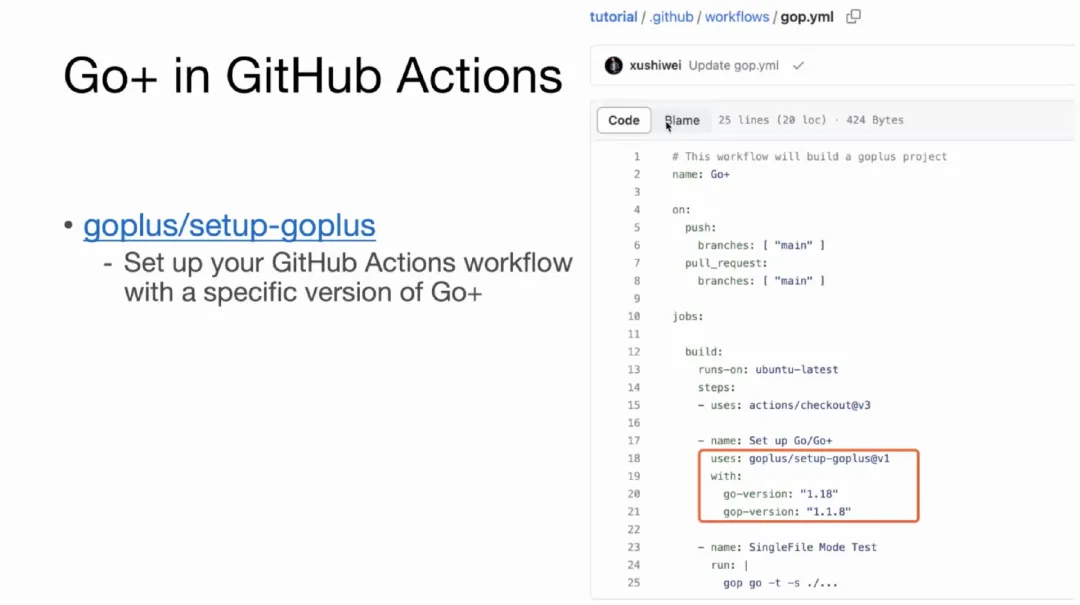 我想重点和大家介绍 IDE 和 GitHub action 的部分,有了这两个部分可以说 Go+ 在工程实践方面就非常完备了。首先前段时间我们发布了 Go+ 的 IDE 插件,可以说非常好用。而在进行工程的时候,我们需要做单元测试、自动编译这样的 CICD,那 GitHub action 可以让 Go+ 迅速被 CICD 所使用。这是非常重要的进步,并且已经被很多 Go+ 项目实际使用。