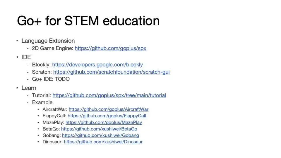 刚才提到 Go+ 是 for engineering、for STEM education、for data science 这三个领域,当然在这三个领域,它的成熟度是不一样的。我就重点围绕 Go+ 在这三方面的成熟度展开。