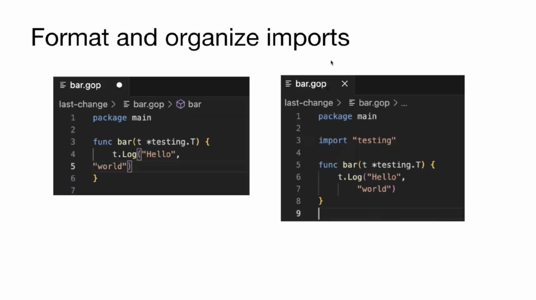接下来是格式化。在 Go 语言中,通过 bs code 插件已经能实现这样的功能,在 Go+ 中也是同样,它会自动帮我们写包中的语句。比如图片上的示例,不仅格式变漂亮,语句也被自动加上了。