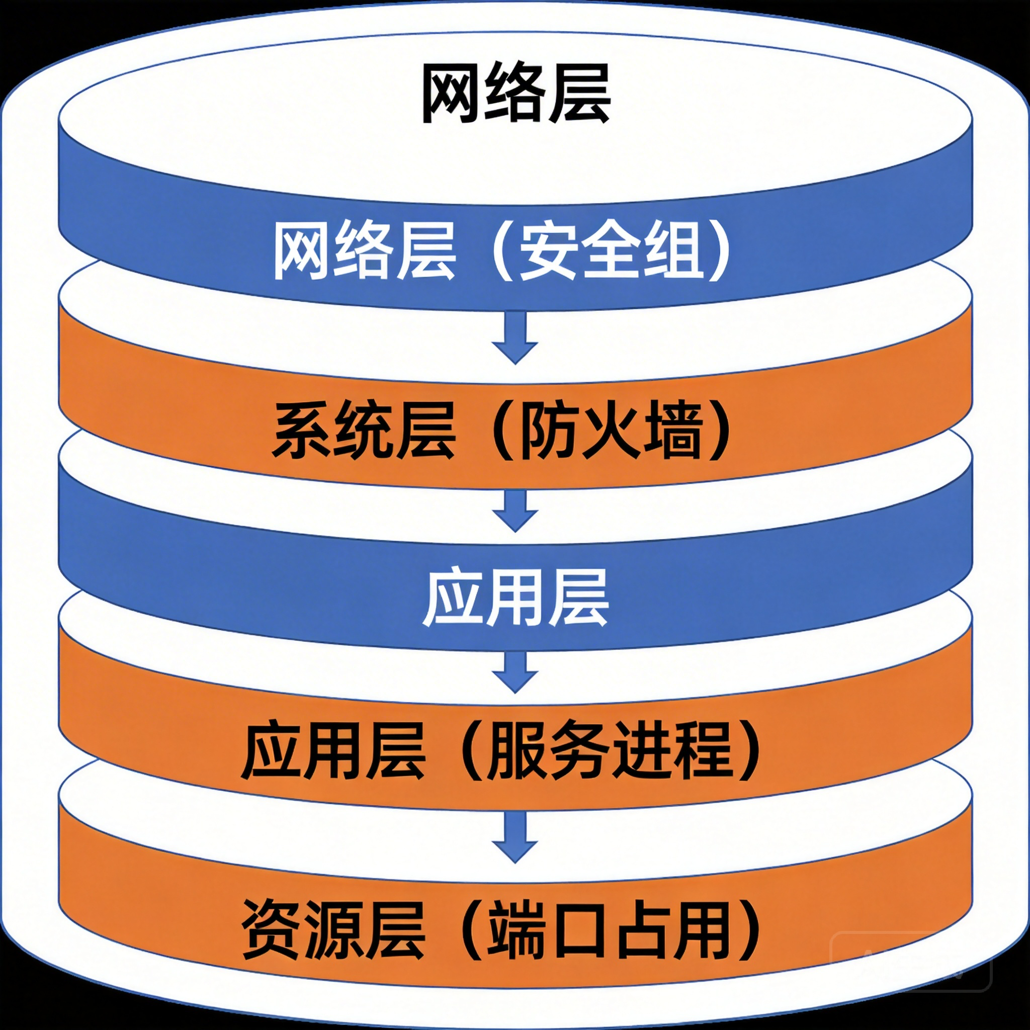 排查优先级:安全组 → 系统防火墙 → 服务状态 → 端口占用