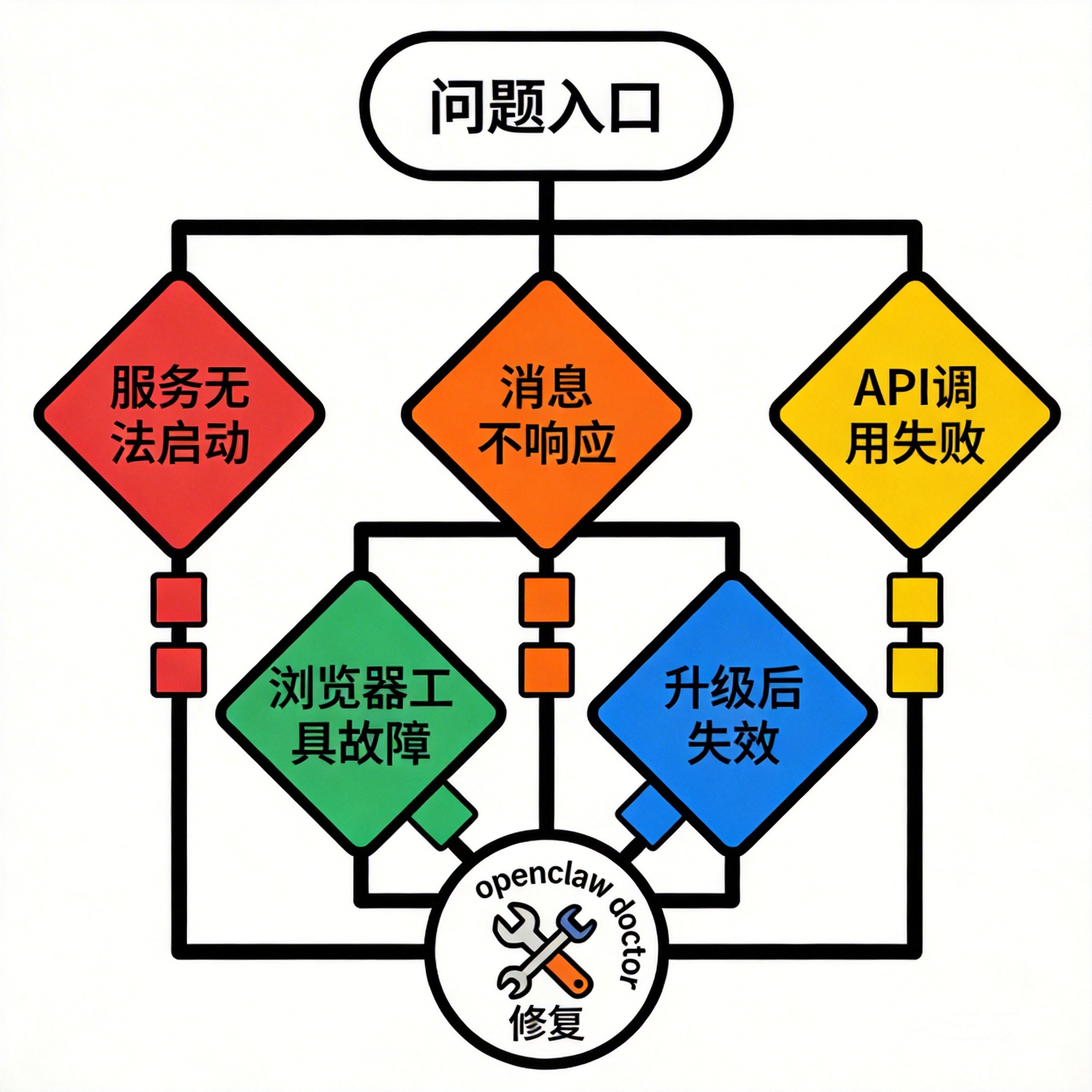 OpenClaw 问题排查的第一步,永远是运行内置诊断工具 openclaw doctor——它能自动检测配置缺失、端口冲突、认证失效等绝大多数常见问题,并通过 openclaw doctor --fix 自动修复可处理的故障。本文覆盖五类高频错误(服务无法启动、消息不响应、API 调用失败、浏览器工具故障、升级后失效)的完整排查流程,帮助开发者在 10 分钟内定位并解决问题。