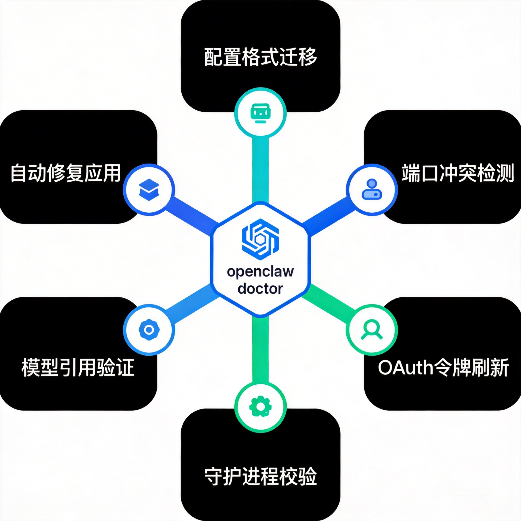 自动修复范围:旧版配置格式迁移、OAuth Token 刷新、端口冲突检测、systemd/launchd 守护进程配置验证、模型引用校验。