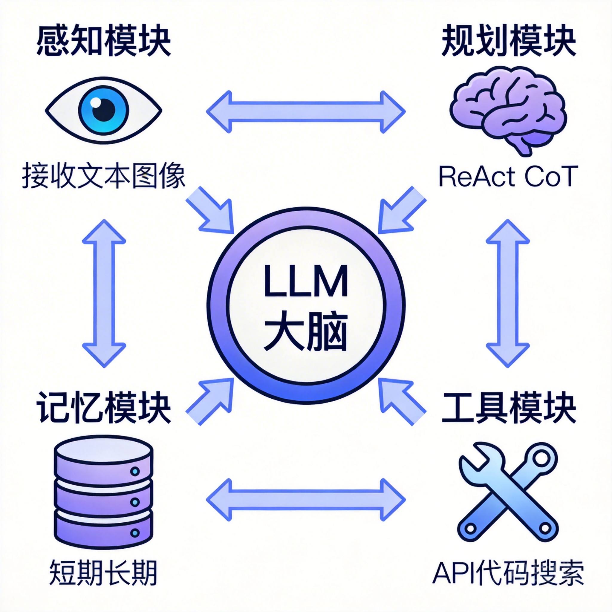 AI Agent 是以大语言模型(LLM)为核心推理引擎,配备感知输入、规划决策、记忆存储、工具执行四大能力模块的自主 AI 系统。