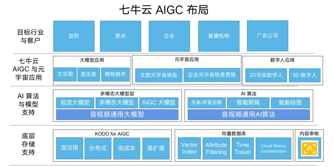 今年,七牛云将进一步完善 AIGC 赛道的布局,并推出一站式 AIGC 解决方案。服务底层框架是七牛云基于十多年对象存储经验,开发的 KODO for AIGC 以及向量数据库。多模态大模型层与生态合作伙伴发布多模态大模型以及行业大模型,结合多年来积累的音视频与图像 AI 算法,为海量的图像、音频和视频数据提供数据分析,处理与监管能力。同时,七牛云通过研发一系列的 AIGC 应用,为政府、企业、直播机构和广告公司等领域提供一站式 AIGC 服务。通过与生态链上的企业合作,七牛云利用音视频存储和处理能力、多模态大模型、数字人等,致力于实现数字化营销的视觉化场景在企业应用中的落地。