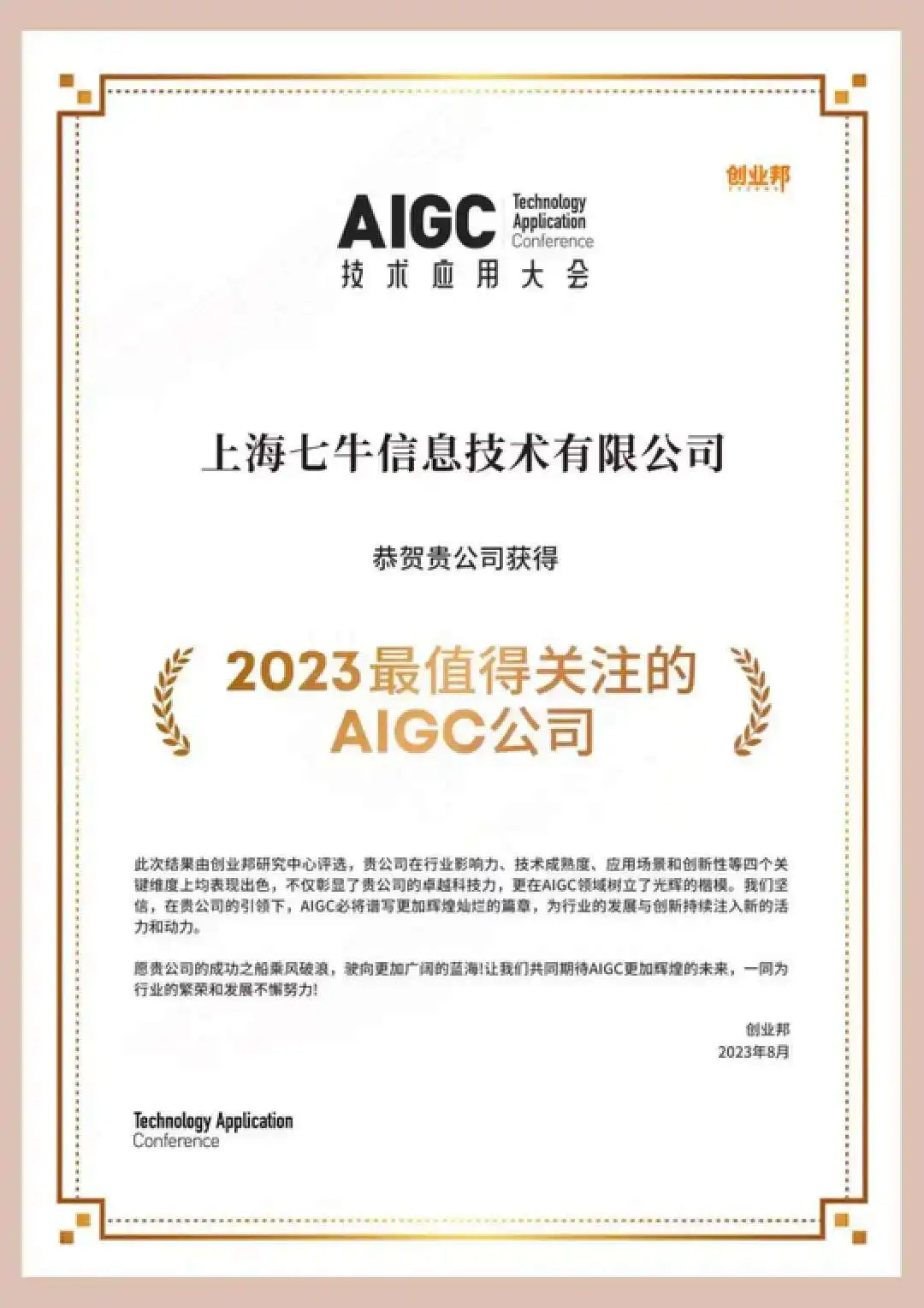 随着人工智能技术的不断发展,AIGC 已成为引领未来的一次重要力量。七牛云将继续加大对 AIGC 的研发投入,并与合作伙伴一起推动 AIGC 在各行各业的应用和发展。最后,本次大会还发布了「2023 最值得关注的 AIGC 公司」榜单,七牛云有幸入选。