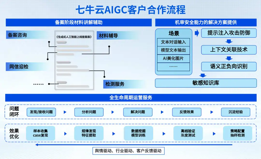 《生成式人工智能服务管理暂行办法》的颁布,明确了 AIGC 海量生成数据需要纳入监管审核范围。在监管合规性、用户体验和社会价值与责任的多重要求下,内容风控能力成为了平台运营的基础能力之一。七牛云紧密贴合 AIGC 行业特性,推出一套完备的「AIGC 内容安全一体化解决方案」,涵盖图片、文字、音视频内容审核以及备案支持等方面。尤其针对智能体、问答模型、大语言模型、多模态模型等场景,提供柔性处置策略。
