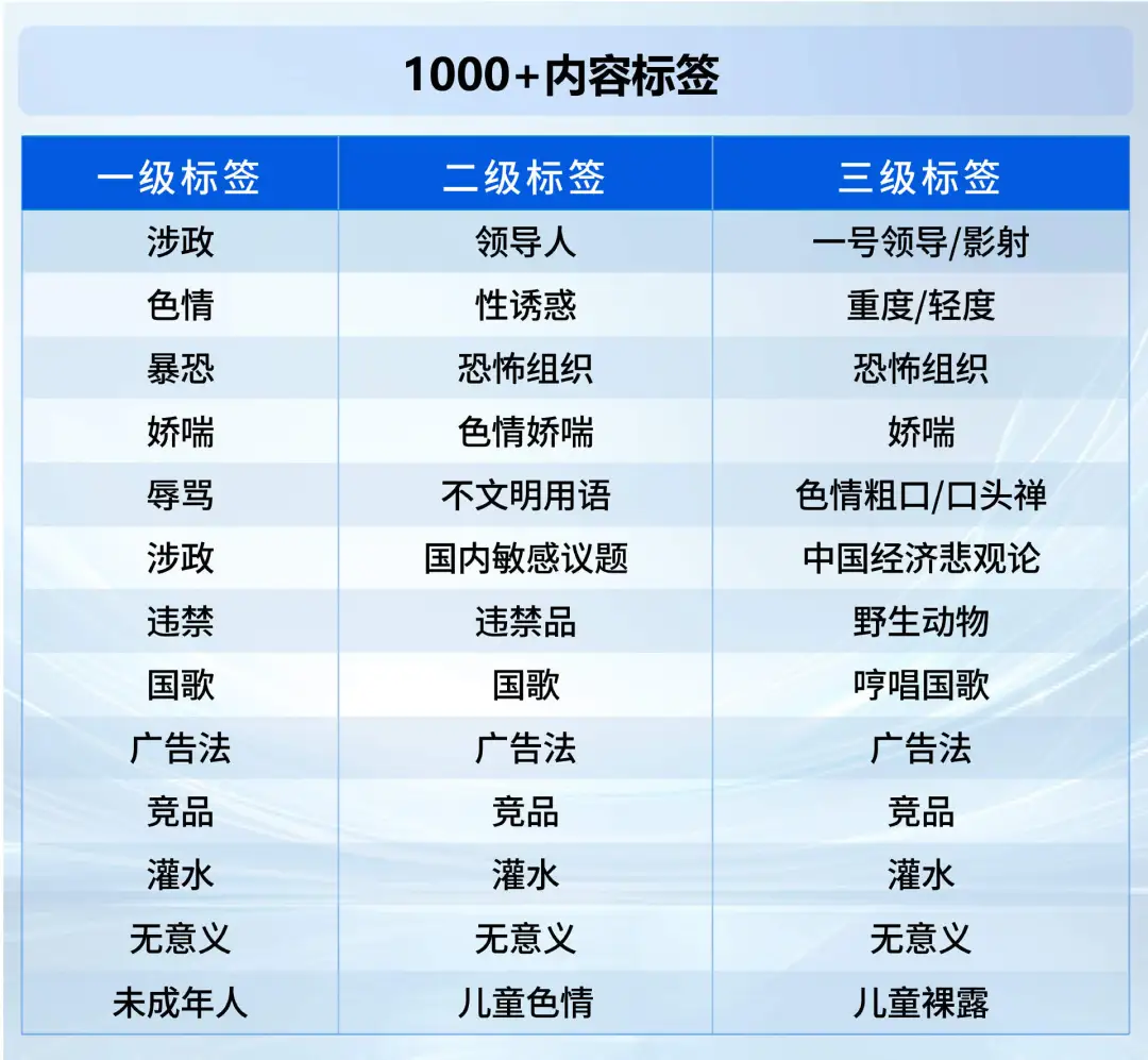 定义风险是内容安全体系建设的核心部分。建立了涵盖文本、视频、音频等内容的四级内容标签体系,拥有涉政、涉黄、暴恐、辱骂、违禁等 1000 多个细化内容标签,实现更高效、更精细的内容识别。