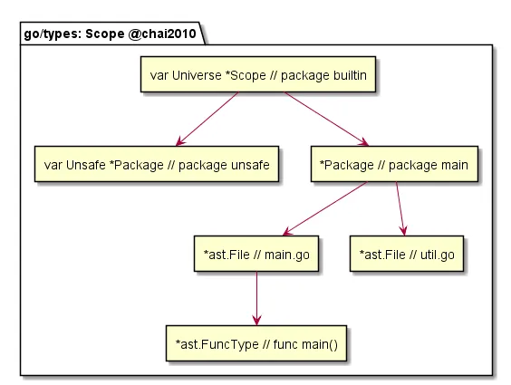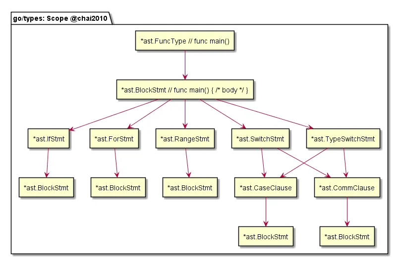 上图为在 body 内部中的流程。看起来很复杂,但对应的其实就是 Go 的各种语法结构。只要可以产生新的命名实体的地方,就会有新的 Scope 产生。这里的嵌套逻辑如下: