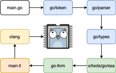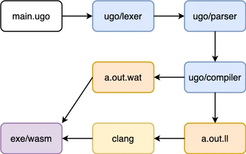 μGo 的架构和 TinyGo 很像,但更小一些。在语法解析后没有类型解析,也没有类型的检查,直接进行 compiler。整个的流程只要代码是 ok 的,就可以先执行出来产生代码,然后再进行完善。目前还在初级阶段。