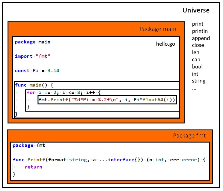 上图是词法域的直观展示。在 func main() 中大家可以看到逐层的嵌套。特殊的地方是 Pkg 内 File 之间的命名实体可见(但不包含 import)。