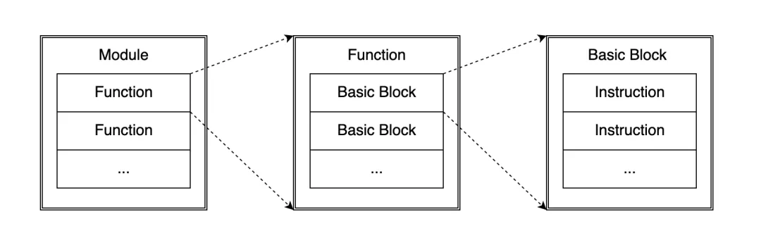简单的结构如上图所示。模块中有很多全局函数,函数内部存在很多 Block,Block 中又存在很多指令。