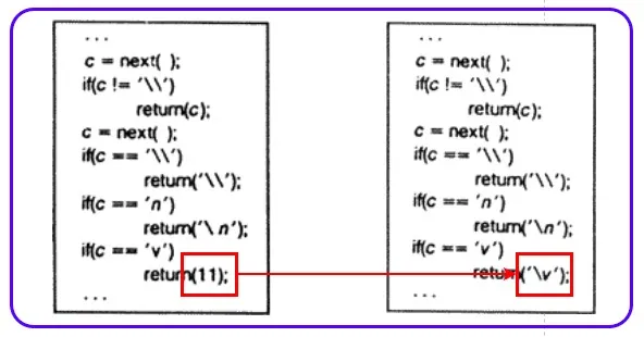 这里要说明一个背景。我们现在写编译器很轻松,任何的语法都可以自由使用。但汤普森在上世纪 70 年代开发 C 语言编译器时还没有太多的工具。比如给 C 语言编译器增加转义字符的支持时,编译器本身不支持写转义的 \v 时,无法进行编译,这时只能先输入一个整数 11,将编译器自身编译为可执行程序,赋予\v 转义的值 (11),然后将 11 改写为 \v 使得代码更直观,再用刚才的二进制程序进行重新的编译得到更强的二进制编译器,然后编译器本身代码才可以用新的语法。