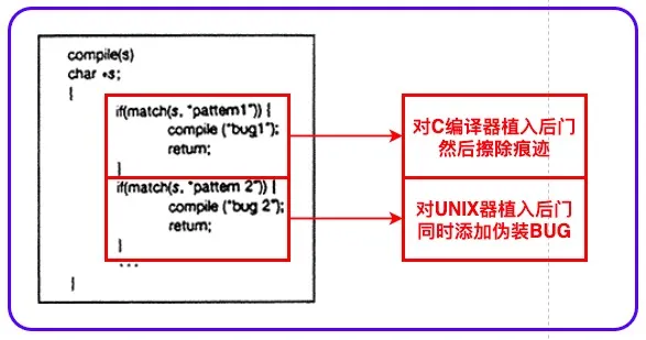 当时贝尔实验室的 Unix 操作系统都是用汤普森写的编译系统进行编译,有一天有人有发现账号被汤普森入侵,意识到 Unix 系统有后门,在修改后门后却发现汤姆森还是可以入侵他的账号,这些大佬都很郁闷,不知道怎么回事。
