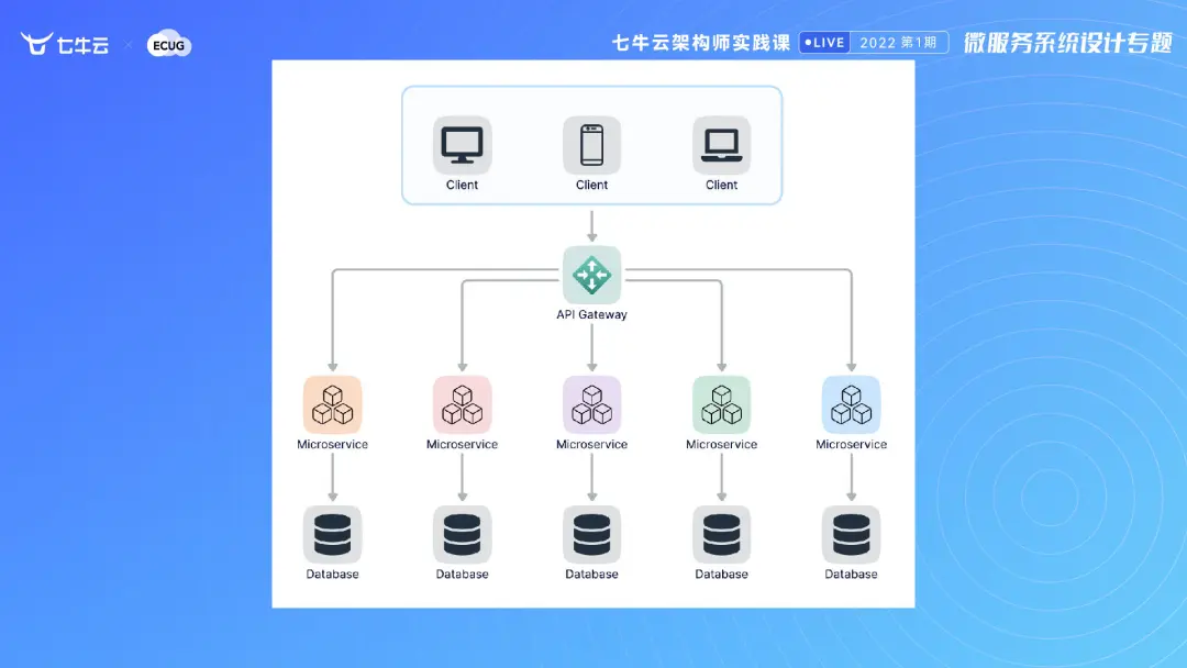咱们接下来可以看下图,如图所示有 5 个微服务,每个微服务都有各自的 DB,每个 DB 上面对应自己的微服务。 所以我一直在强调,我们每一个微服务,应该有自己的 data store,不应该直接访问别人的 DB,这是非常非常重要的点。我们在微服务上有 API getaway,通过 API getaway,让 A 服务就到 A 服务,B 服务就到 B 服务,我们会梳理倒流过去,这是微服务的架构。看起来很简单,但是其中每一个环节里面都有承载者,都包含着刚才单体服务的引进。这是微服务的概览。