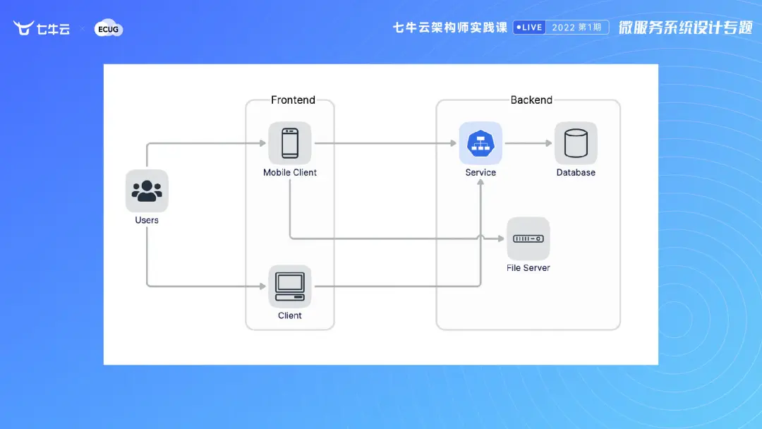 首先从单体说起。很多人在业务初期会有这样的想法,先找个微服务框架,再做一系列设计和架构。其实在业务起步之初,这种情况很常见。大家都知道对一个业务,特别是创业公司来讲,成功概率是非常低的,可能做了一年半载,用户只有几万乃至几千,项目不一定能起来,此时就未必要使用微服务的方案。 所以我根据自己的经验,想和大家分享创业或小项目,应该如何一步步往前走。 针对目前的情况,移动互联网肯定是占大头,所以业务有手机端,如果更友好一点会做桌面端。那么对我们来讲,项目之初可能只有一个单体服务,后面挂一个 DB。在一般情况下,我们会有静态资源,挂一个 File Server,比如说 Nginx 之类的,这样都可以进行访问,对小业务而言已经可以跑通了。 但是随着业务发展,这种场景能支撑的量是比较小的,而且它没有对故障容忍的方案。所以说当业务有一点发展以后,我们可能就会用到这样的方式。也就是在前面挂一个 Nginx 作为反向代理,后面再挂三五台主机,这样就可以支撑好几倍的量了。