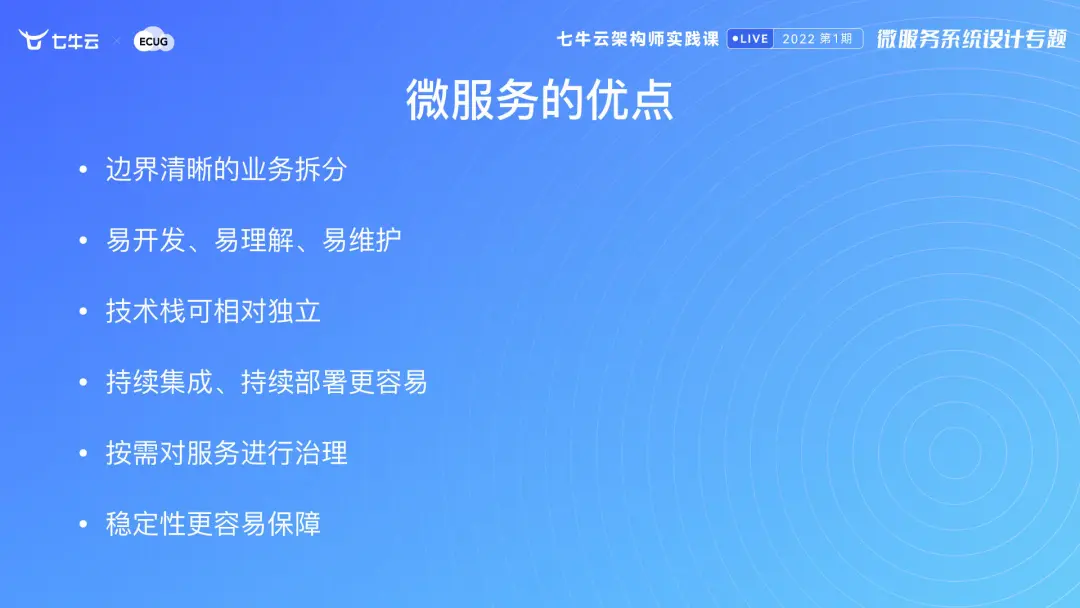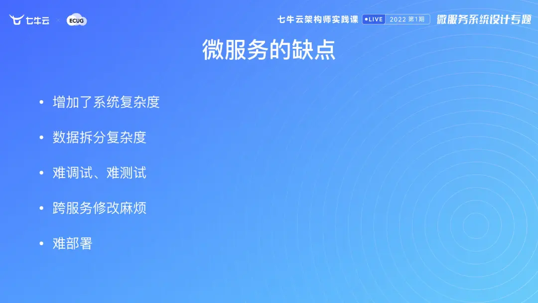 首先第一个优点,单体对我们来讲开发真的很简单。对 go 来讲就是一个二进制文件,你 build 完了,打一个 docker 镜像,把它上传到云厂商一般都会的有私有仓库,你也可以用 go-zero 提供方法,帮你一键做出一个大概 10M 的 docker 镜像。这和以前 java 几百 M 甚至几个 G 的镜像是很不一样的, go-zero 也自带 Dockerfile 的生成方法。 同时单体的测试很容易。在社区里经常有人问微服务怎么调试?这是很难的问题,如果我有上百个微服务,在本机上全跑起来,公司要么给每个人配一个顶级的电脑,成本高昂,要么提供开发的环境,需要多租户,否则相互之间会有影响。但是单体的测试就很容易了。 单体的部署也非常简单,因为相互之间没有依赖,不会互相影响。我们写单体的时候,发版就好了,不会说要找谁分析依赖关系,大家没有太多的心智负担。 优点说完了我们来看缺点,我认为最大的缺点就是扩展难。业务发展以后,功能越来越多,但凡加一个服务,全局可能受到影响。同时小改动导致全量更新,我们曾经就遇到过类似问题,更新了一个小功能结果导致整站挂掉。所以任何一个改动就要全站更新。而据行业不完全统计,基本上 80% 以上的故障都是更新导致的。所以小问题引发大故障,是蛮严重的问题。最后就是单体承载的业务规模非常有限,因为业务规模大了以后,人、业务、数据都会很多,很难通过服务拆分的方式,去承载业务规模的增长。 以上就是我为大家总结的单体优缺点。