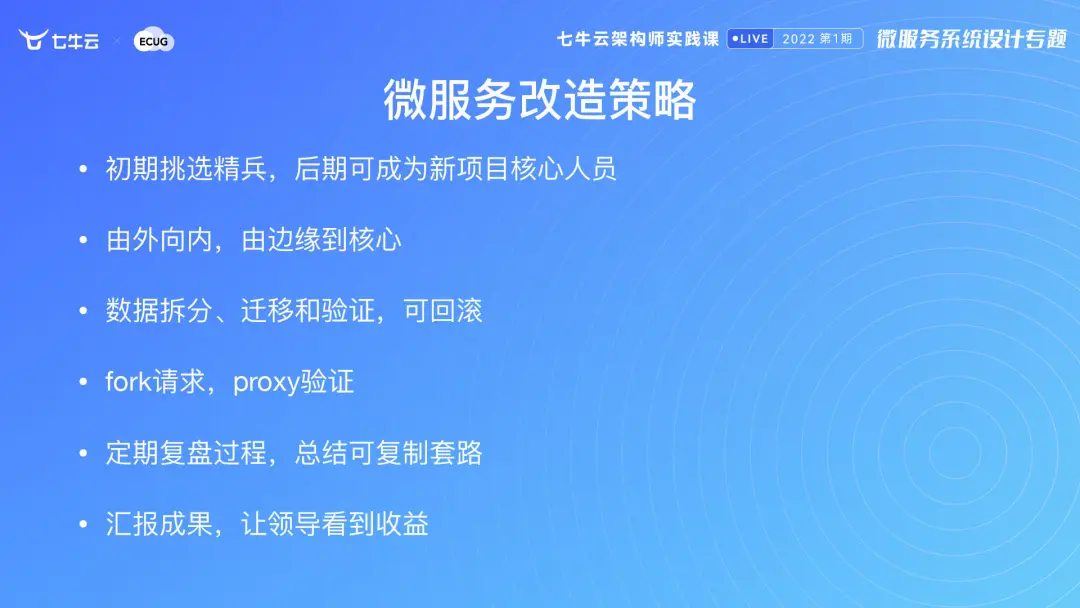 我们在微服务的改造中,需要要讲究策略。 初期要挑选精兵,在改完之后这些精兵可以变成项目的核心人员。比如我之前例子中微服务的五个部分,我每一个都需要核心人员把控质量。在前期的时候,打磨的不光是产品和架构,更重要的是人。人打磨出来以后,后面的项目往前推进,就会非常容易。 同时在改造过程中,我们要把握从外往内、从边缘到核心的原则。一定要有业务预期,一定要有故障的预期,从外往内也就是让故障可控,让问题在非核心的地方先暴露,这样再往核心逐步推进。 接下来我们要关注数据的拆分、迁移和验证。数据如果不正确,基本上来讲改造是白改。而且在改造的过程中,特别特别重要的一点就是一定要可回滚。你不能说改了,上了,挂了,业务没了。所以说改造的过程中,一定要让业务可以回滚到原来的系统里,让它能跑,这样一来就不用那么提心吊胆,心态上就轻松很多了。 我们在改造的时候,最好每天都要复盘,改造过程一般不会太长,半年时间基本上主体的改造就能完成。这个过程中,越早期越要多进行复盘,这样能越早总结经验教训,加速改造。 最后一点也非常重要,就是成果要及时回报。比如之前的项目做了五个月,开学前上线后服务增长了四倍,非常平稳效果很好。但是这五个月中如果缺少汇报,领导就不知道你在干什么,价值在哪里。所以汇报不是为了邀功,更重要的是管理预期,让改造能平稳地执行下去。很多技术人不太关注这个点,但其实挺重要的。