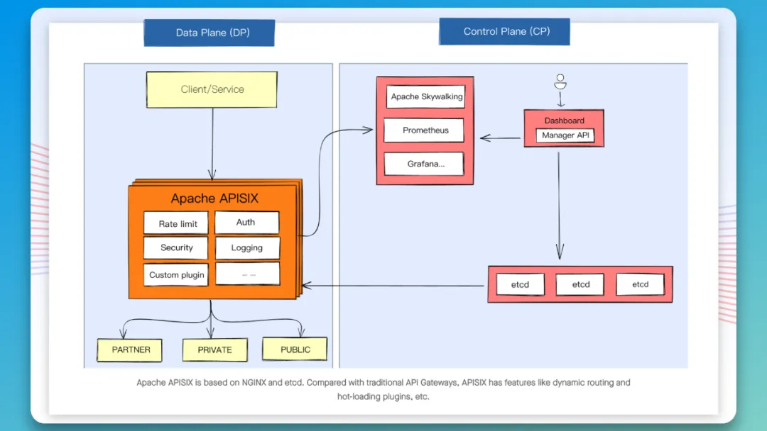 APISIX 的架构主要分成两部分。第一部分叫做数据面,它是真正去处理来自客户端请求的一个组件,去处理用户的真实流量,包括像身份验证、证书卸载、日志分析和可观测性等功能。数据面本身并不会存储任何数据,所以它是一个无状态结构。