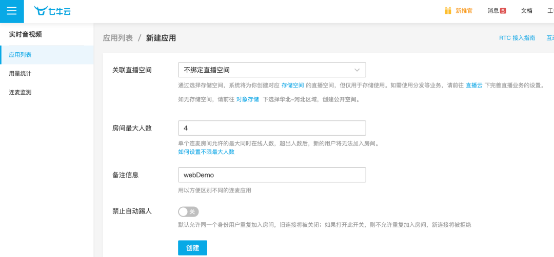 注册并认证之后,打开“产品与方案”,选择“实时音视频”,创建一个应用,即可获取七牛云 appid。