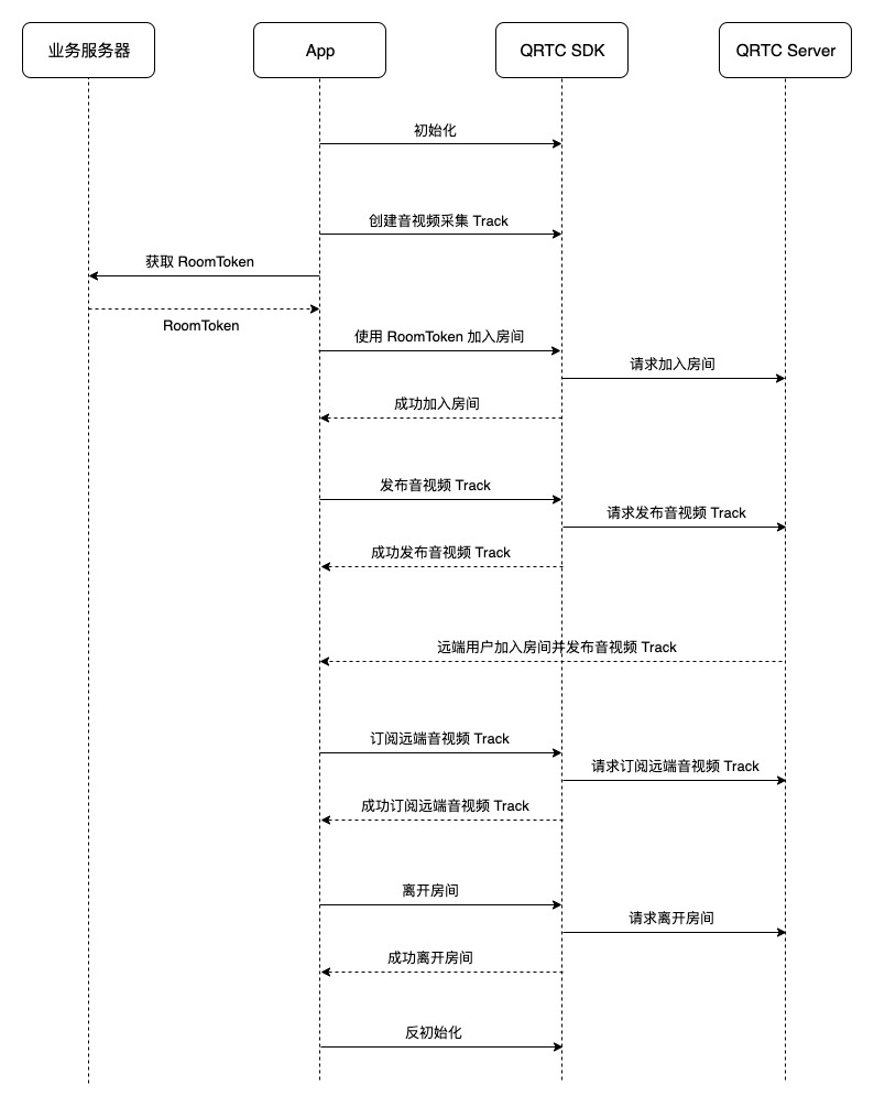 基于【前期准备】你已经获取了七牛 appid 和临时 token,本小节将介绍 Web 端如何集成七牛云音视频 SDK,实现 1V1 音视频通话。在开发之前,需要了解实时音视频通话的基本流程,流程图如下: