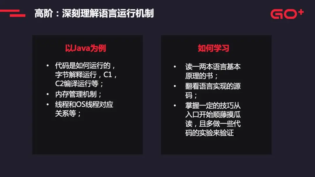 下一个话题是关于如何学习语言的运行机制。我自己觉得,怎么去学好每一门语言背后整体运行的机制,对高阶的程序员来讲非常重要。