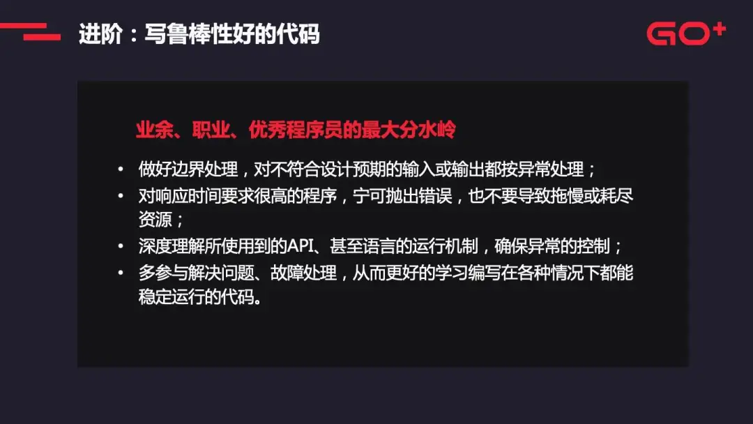 第二个阶段是进阶,对程序员来讲就是一个比较高的挑战,怎么写鲁棒性非常好的代码。