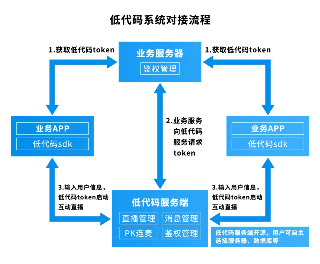 3. 「低代码接入,快速上线应用」:传入用户信息,根据业务需求,启动互动直播。