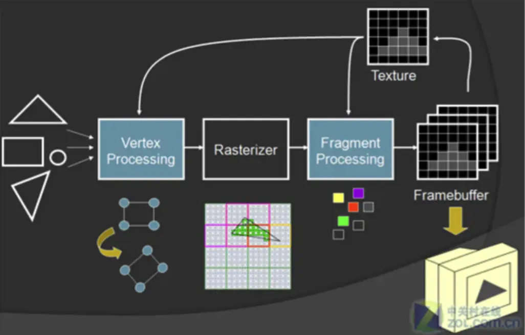 上图为 openGL 中的渲染过程。图中最左侧的三角形、圆形、长方形等为图元,也可以认为是精灵。精灵由什么组成?网格通过光栅化的方式呈现到屏幕上。假设想呈现一个三角形,应该如何上色、添加效果?这就需要经过第二个阶段,使用着色器。