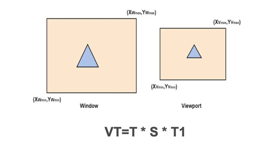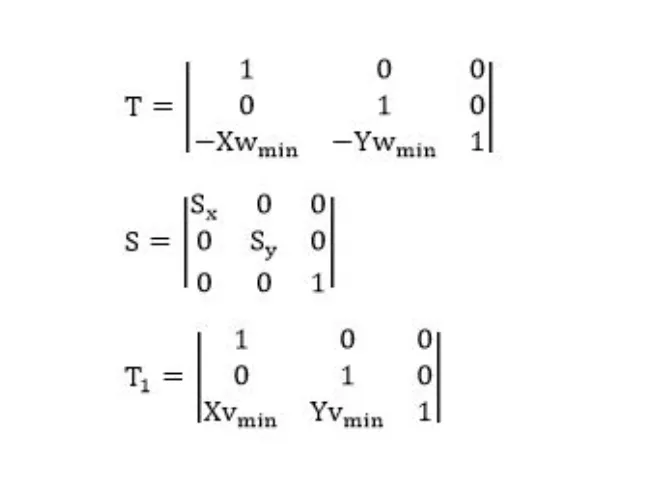如上图中的矩阵所示。首先有一个裁剪区域 Xw,代表左上角至右上角的一个区域,通过缩放实现从 ViewPort 到 Windows 的转化。从矩阵中我们可以看出首先平移至做小角,进行等比缩放,然后再平移回来。