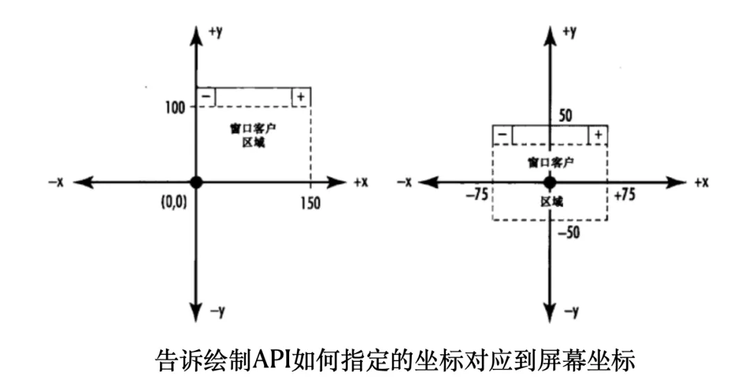 上图左侧为世界坐标体系,也是常说的逻辑坐标体系,是在视口(viewport)下的坐标体系。图中的红色为裁减窗口,也就是显示区域。在逻辑坐标体系中,会将显示区域归一化到视口体系,再映射到 Windows 的坐标体系。