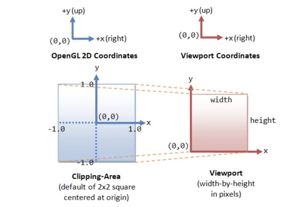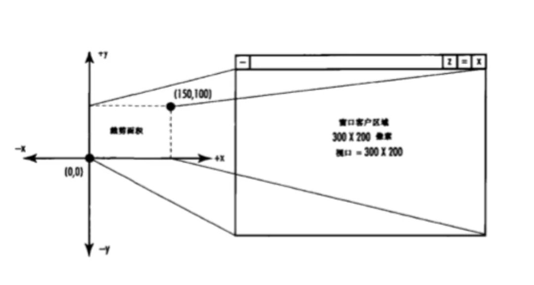 上图中远端的小型区域便是裁减面积是所谓的视口(viewport),窗口客户区域也就是 Windows 窗口,我们通过将每个像素与窗口的物理坐标系进行匹配,便可得到当中的映射关系。