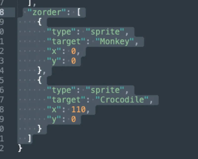 如上图配置,包含猴子和鳄鱼两个动物,猴子在世界的 (0,0) 位置。当没有设置局部坐标的位置时,(0,0) 位置会出现在猴子的左上角,但这不符合我们的预期,我们希望 (0,0) 位于猴子本身的正中间,所以我们需要先去修改它的局部坐标,修改中心点的坐标到猴子的中心点,也就是将世界的 (0,0) 和猴子的中心点保持一致,从而让猴子出现在世界正中间。