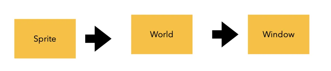 整体的流程便是通过使用物体的坐标构建世界坐标场景。比如一个精灵「猴子」,位置是 20*20,这是一个物体的坐标,是给逻辑坐标系定的尺度。有了这个尺度后,需要将世界坐标体系转化到视口(viewport)体系中,归一化到一个区域中。