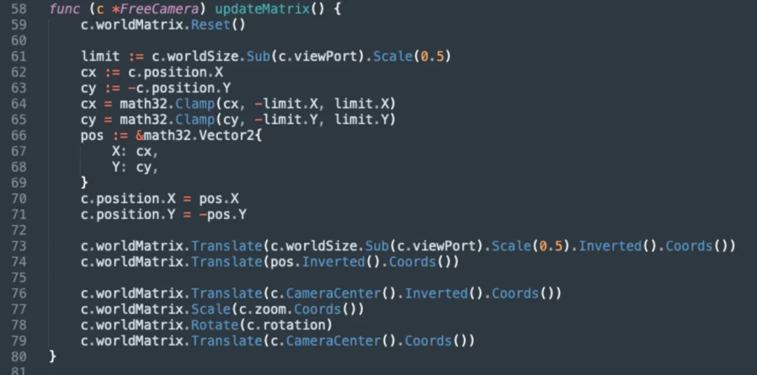 第 61 行到 66 行,主要是完成将相机约束在世界中;第 70 行到 71 行,是用来适配坐标体系;第 73 行到 74 行,是在进行平移操作,让相机的中心平移到世界中心,让相机的坐标体系依附在世界中心的最中间。