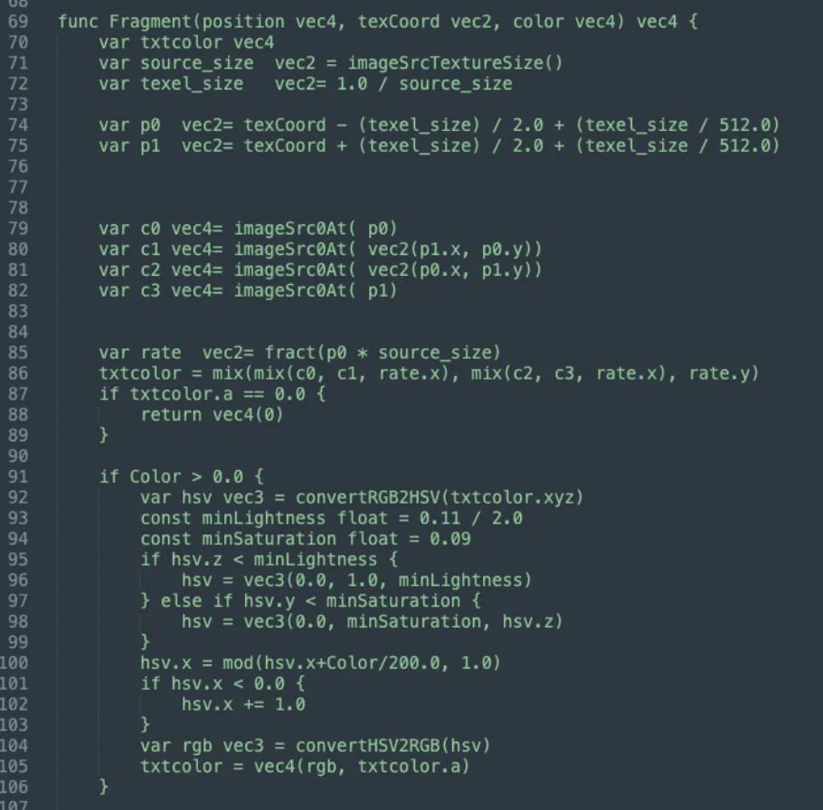 上图中代码的第 69 行,是 shader 的入口,它传递了重要的两个信息,精灵的位置和贴图的位置,我们可以通过这个信息取得图片的尺寸与大小。
