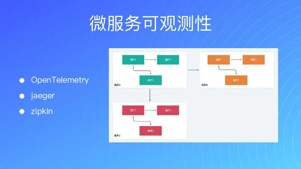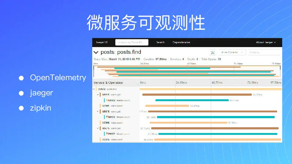 所以对我们来讲,做微服务的可观察性是要拥抱行业标准的。最早 Open Telemetry 没出来的时候,我自己去设计了一套,把整个链路的深度在框架里面去做了自动检测。但是后来 Open Telemetry 出来以后,咱们还是尽可能地去拥抱行业标准,这样你才可能建立起一个生态。