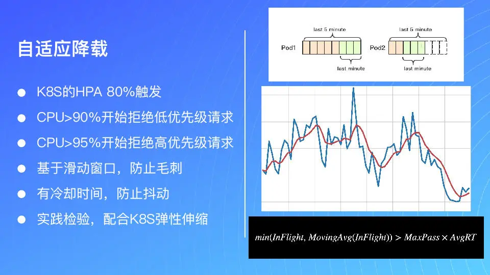 而在这个过程中,首先请求进来以后先去做并发控制,然后去做限流。限流做好了以后,我们就会有自适应的降载,保障我们的集群不会挂掉,然后配合 Kubernetes 弹性伸缩,就能保证整个集群因为有流量波峰过来,导致整个服务的不稳定。