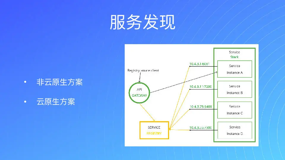 除此之外还有云原生的方式,其实对我们现在来讲,云原生的方式就相对来就比较容易,在 Kubernetes 里面就有一个虚拟的 service,你去访问这个 service 就好了。但我们怎么去处理服务发现呢?其实说白了,就是有一个服务注册的中心,那我们后面的每一个服务都会上报到服务注册中心去。我要用的时候就可以直接去调用它,这是比较传统的方式。