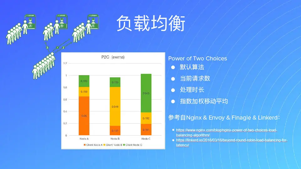 对高并发系统来讲,处理负载均衡也很重要。负载均衡常用的用法是在 Nginx 加权重,我加一个 weight,然后用 Round Robin 的方式去处理。当有一个节点挂掉的时候,就需要去把这个节点从 Nginx 上摘掉,然后再增加一个节点时,在 Nginx 上再去配。当然 Nginx 加上 live list 是以前比较传统的方式。